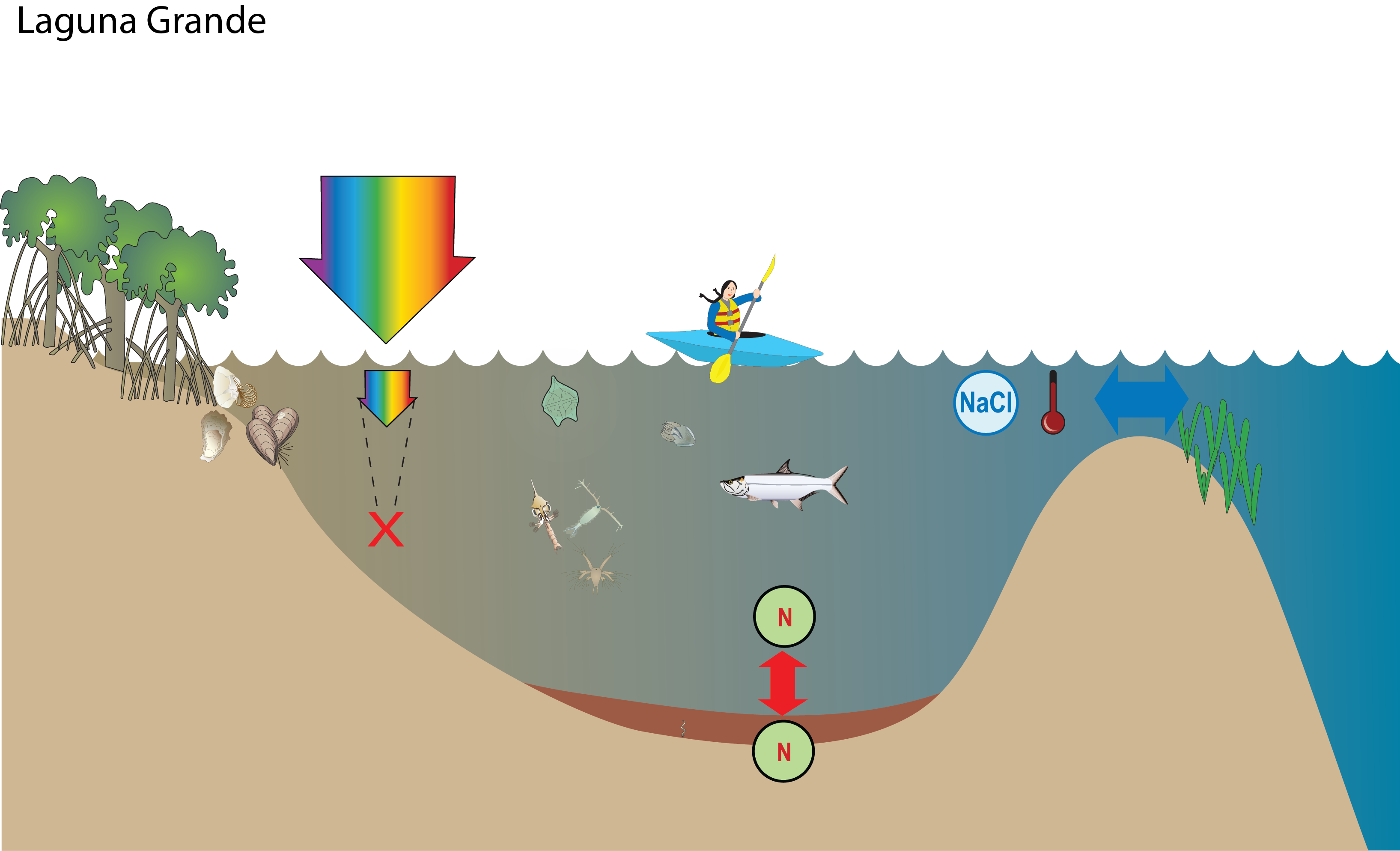 To do this, we are measuring primary production by the algae, grazing by the dominant copepods, and grazing by the microzooplankton. We are doing all these measurements using various incubation techniques that are well described in the literature and have a long pedigree, though none have been done in bioluminescent bays, to our knowledge. In addition one of our colleagues is looking at the flux of nutrients between the sediments and the water, again using tried and true techniques in a new place. At the end, once the students have processed all the samples and crunched all the numbers, we hope to put this together into a numerical model of the lagoon, so we can then test what could happen if conditions change. We started with a conceptual model that the students developed today, so that we have a framework with which to begin building the numerical model. Please note that these are drafts, created in Illustrator with the UMCES IAN symbol library.