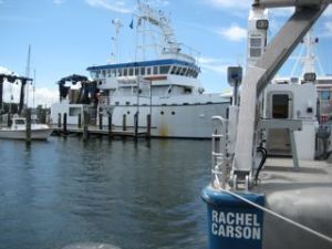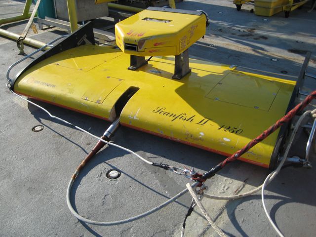 We arrived on site just north of the Chesapeake Bay Bridge near where the main channel gets shallower to the north. We deployed the Scanfish at 0800 and began towing to the south. The Scanfish is a big yellow wing-like device that undulates up and down through the water-column measuring salinity, temperature, oxygen, fluorescence and turbidity. We towed it to the mouth of the Choptank R. when Mary Doherty noticed that the air conditioner in the isotope van stopped working. It got really hot in there. So we continued towing to the mouth of the Patuxant R. and arranged for HVAC repairmen to meet us at the dock at Chesapeake Biological Laboratory in Solomons, MD. We pulled the scanfish out of the water and docked at CBL next to the R/V Rachel Carson. After a couple hours, a lot of head scratching, and a little acetylene torch action the AC was fixed and we headed back to the deep channel of the Chesapeake Bay to continue our scan. Unfortunately the Scanfish stopped working. Wynn Tucker and Mary Moore repaired it and we were off again. We finally finished our Scanfish survey off the mouth of the Rappohannock R. at 0430.