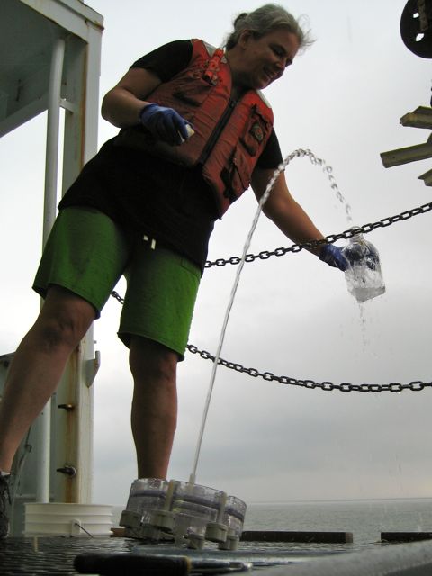 After lunch we began our big CTD cast to collect water at 8 depths. This is the standard profile we do on our day trips to our main sampling station. We lowered the CTD to the bottom, looked at the profile of oxygen and salinity, and selected depths so that three were in the lower layer, three in the upper layer, and two in between. Then the team sprung into action. We turned on our on-deck diaphragm pump and pumped water from each depth up to our sampling manifold. The tubing on our submersible impeller pump detached from the CTD frame during the cast, so we collected all our water samples with the diaphragm pump. Ian Hewson’s team collected large volume water samples (~20L) at the bottom depth and at three meters for metatranscriptomic analysis. My group collected DNA and RNA samples from all eight depths for microbial community composition, collected water in BOD bottles for bacterial production rate measurements, and fixed water in lugol’s solution (iodine and formaldehyde) and gluteraldehyde for microscope counts of protists, bacteria, and viruses. Jeff’s group collected water for a suite of nutrient and geochemistry measurements, and for measurements of aerobic and total respiration. It took a while to get organized in the fairly crowded wet lab, but we got our routine figured out, and we finished pumping after 2 hours. Then everyone dispersed into their lab spaces to process, process, process. We also continued regular CTD casts at 1500, 1700, 1900, 2100, and 2300 hours. At 1500 and 2300 the copepod team collected niskin bottles at four depths to continue their survey. Then we pulled anchor and cruised up the Bay to our next sampling station.