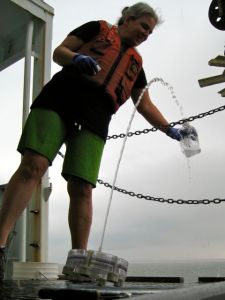 Next we steamed to a shallow site to the east of the main channel (about 8.5m deep), did a quick CTD cast, and then collected a small box core sample. The sediments were too sandy, so we moved to a deeper site where we collected a box core sample and cast the CTD. We then collected cores at an intermediate depth site (14m) and a deep site (27m). Jeff Cornwell and Mike Owens subsampled these box cores to incubate for measurements of sediment sulfate respiration (35-S sulfate reduction), aerobic respiration (change in O2), and total respiration (change in CO2). After their incubations they will sample the top 1 cm of their cores for DNA to assess the microbial community composition.