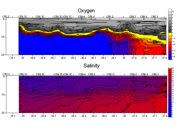 Daniel Lee and I got up at 0430 to look at the scanfish data. Daniel processed the data with Seabird software, and plotted oxygen concentration and salinity using Surfer software. Yesterday we scanfish-ed through the “hydraulic control point” south of the Potomac R. mouth at station CB5.5, and found in that region that bottom water had a slightly higher oxygen concentration than water at middle depth (see the yellow blip of low oxygen at ~9 meters depth at latitude -37.6 on the figure). This seemed strange until we realized this region of the Bay where there is “three layer flow.” The Bay gets shallow to the south, and water moving north off of the shallows flows between the surface water layer and bottom water layer. It looks like this water is unusually low in oxygen. Daniel and I agreed that this was too confusing for our project, so we selected station CB5.4 about 10 miles to the north to be our “southerly” station. At this station bottom waters have ~1mg/l oxygen, and would be considered “hypoxic.”